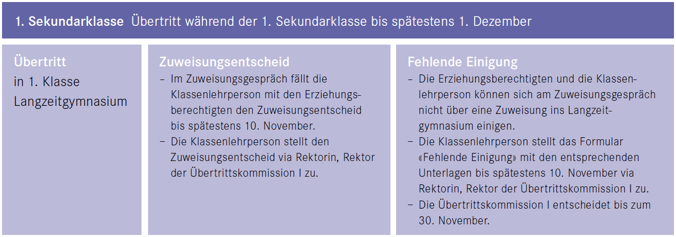 Der Übertritt während der 1. Sekundarklasse in die 1. Klasse des Langzeitgymnasiums richtet sich nach dem Übertrittsverfahren I.