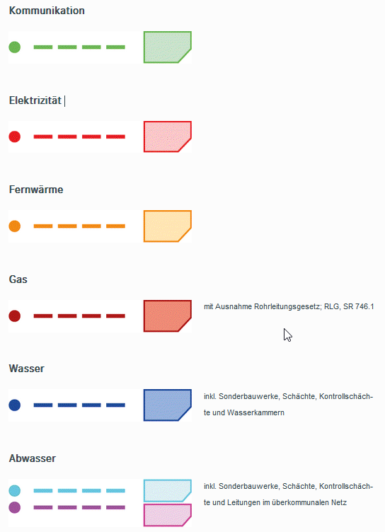 Er bildet die Lage sowie Art und Grösse von Leitungen der Ver- und Entsorgung ab. Deren ober- und unterirdischen baulichen Anlagen werden online zugänglich gemacht. Der Kataster umfasst die Medien Wasser, Abwasser, Elektrizität, Gas, Kommunikation sowie Fernwärme.