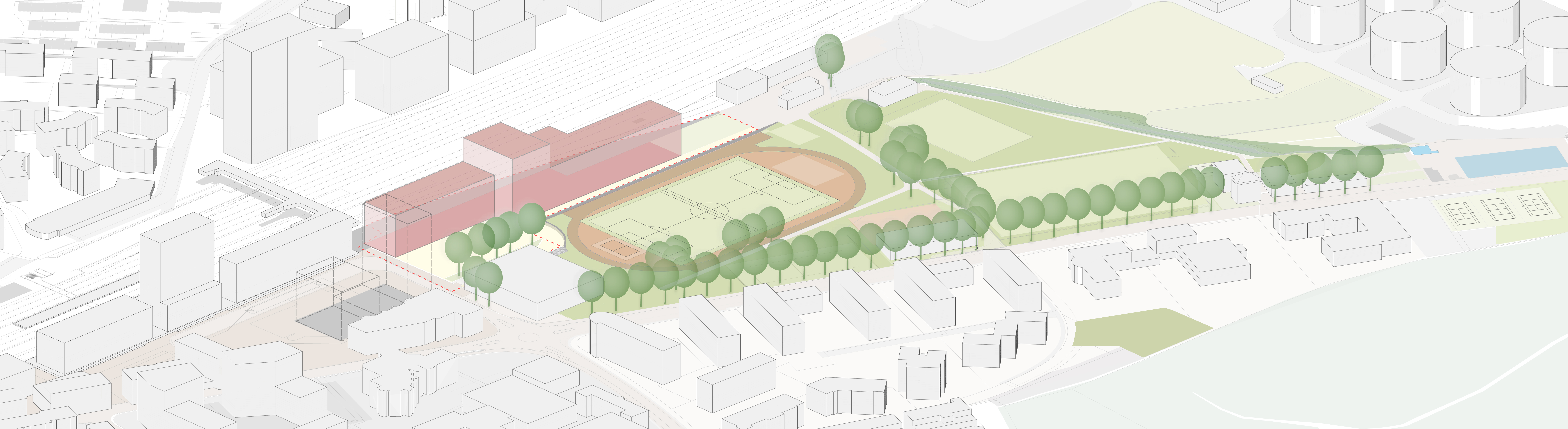 Das Areal der neuen Kantonsschule liegt an zentraler Lage in Rotkreuz. Viele öffentliche Nutzungen der Gemeinde sind hier angesiedelt: das Rathaus, der Saal Dorfmatt, der Sportpark mit seinen Trainingsfeldern, das Freibad und der Festplatz. Mit den parallel laufenden Bauvorhaben der SBB, der Einwohnergemeinde Risch sowie des Kantons Zug bietet sich die Chance, das Zentrum von Rotkreuz zu stärken und attraktiv zu gestalten. Eine koordinierte Planung zwischen den drei Parteien erlaubt es, ein stimmiges Gesamtbild zu schaffen, Nutzung zu kombinieren und dadurch letztlich auch Kosten zu optimieren.