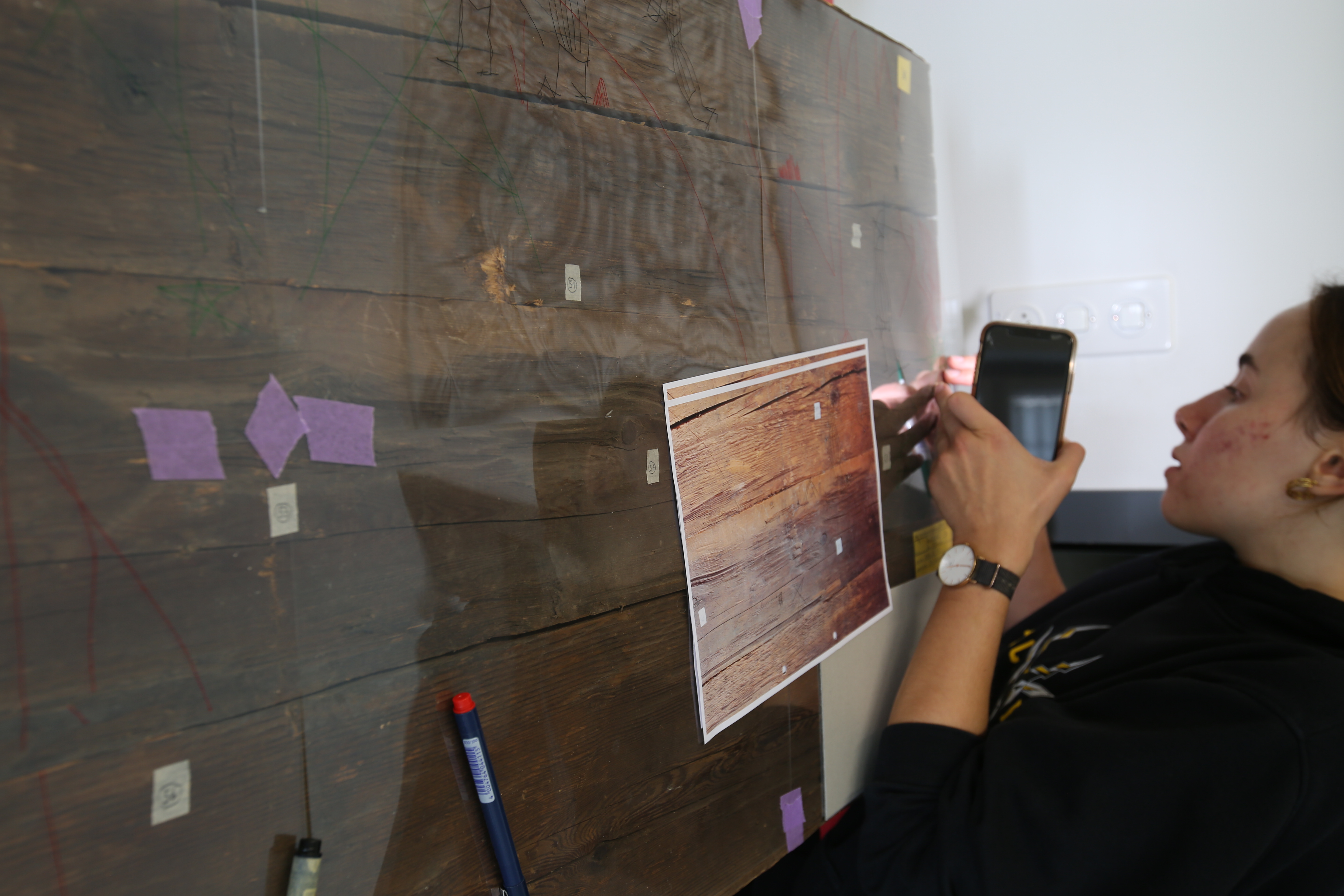 Eine Mitarbeiterin des Amts für Denkmalpflege und Archäologie bei der Dokumentation von Kritzeleien auf einer Blockwand aus einem Haus in Walchwil. Foto ADA ZG, Eugen Jans.