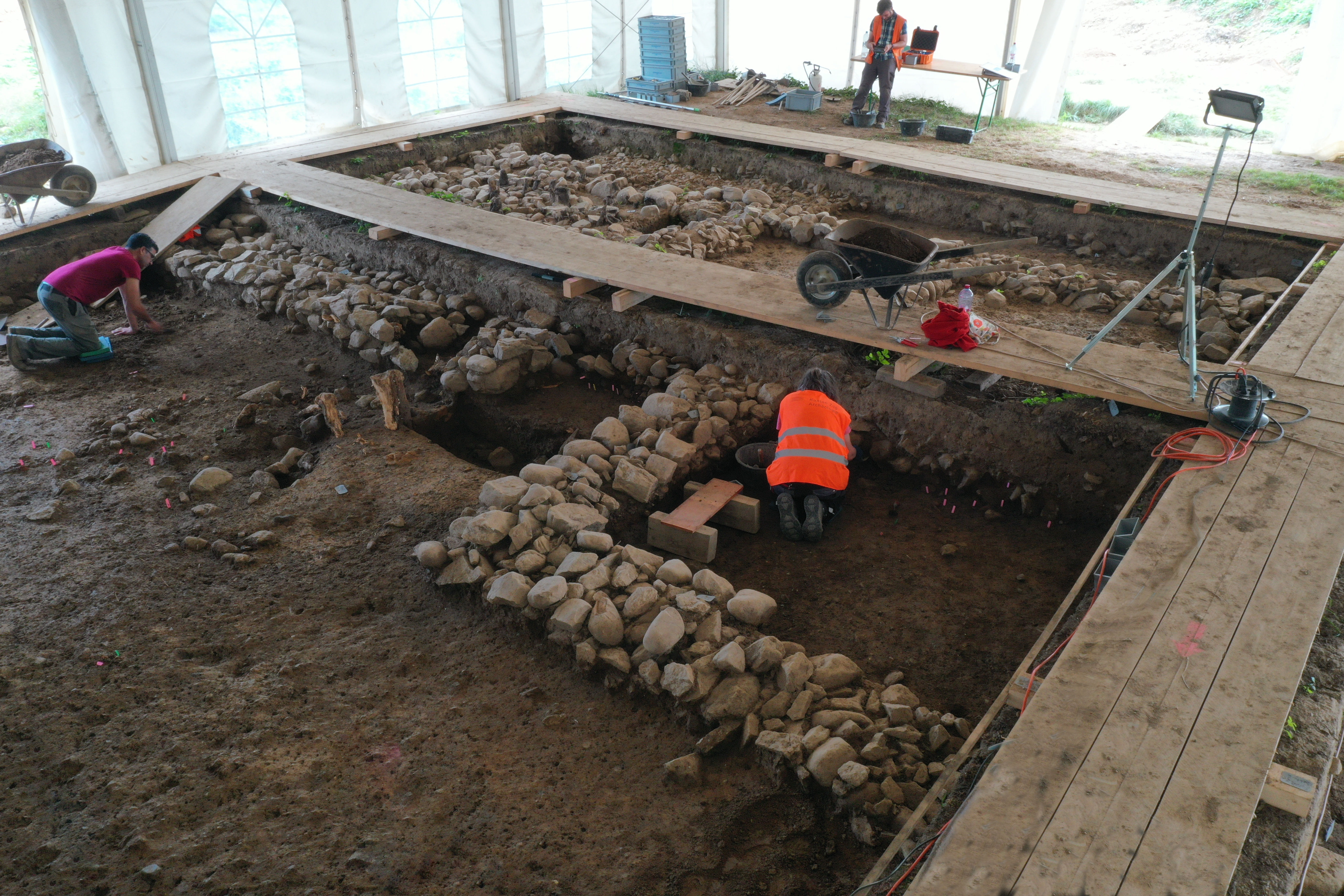 Cham, Aebnetwald. Übersicht Richtung Rigi und Pilatus. Im grossen Festzelt befinden sich die bisher ausgegrabenen Mauern des römischen Grossbaus. Die Ausrichtung des römischen Gebäudes entspricht derjenigen des weissen Zeltes. Foto ADA ZG, David Jecker